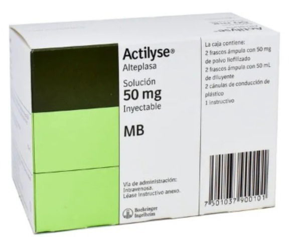 clave C.B. 010.000.5107.00 Cod. Actilyse Alteplasa Solucion 50 mg M.B. Caja con 2 frascos ampula con 50 mg de polvo liofilizado, 2 frascos ampula con 50 mL de diluyente , 2 canulas de conduccion de plastico 1 instructivo. Boehringer Ingelheim